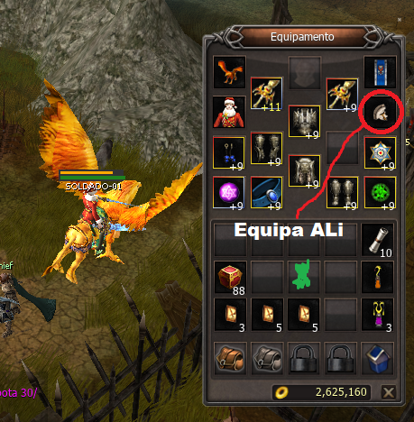 - Agora na foto abaixo, ensino onde deve equipar, mas infelizmente estou sem o amuleto porque já passei dessa quest, mas é ali que você equipa, ok?